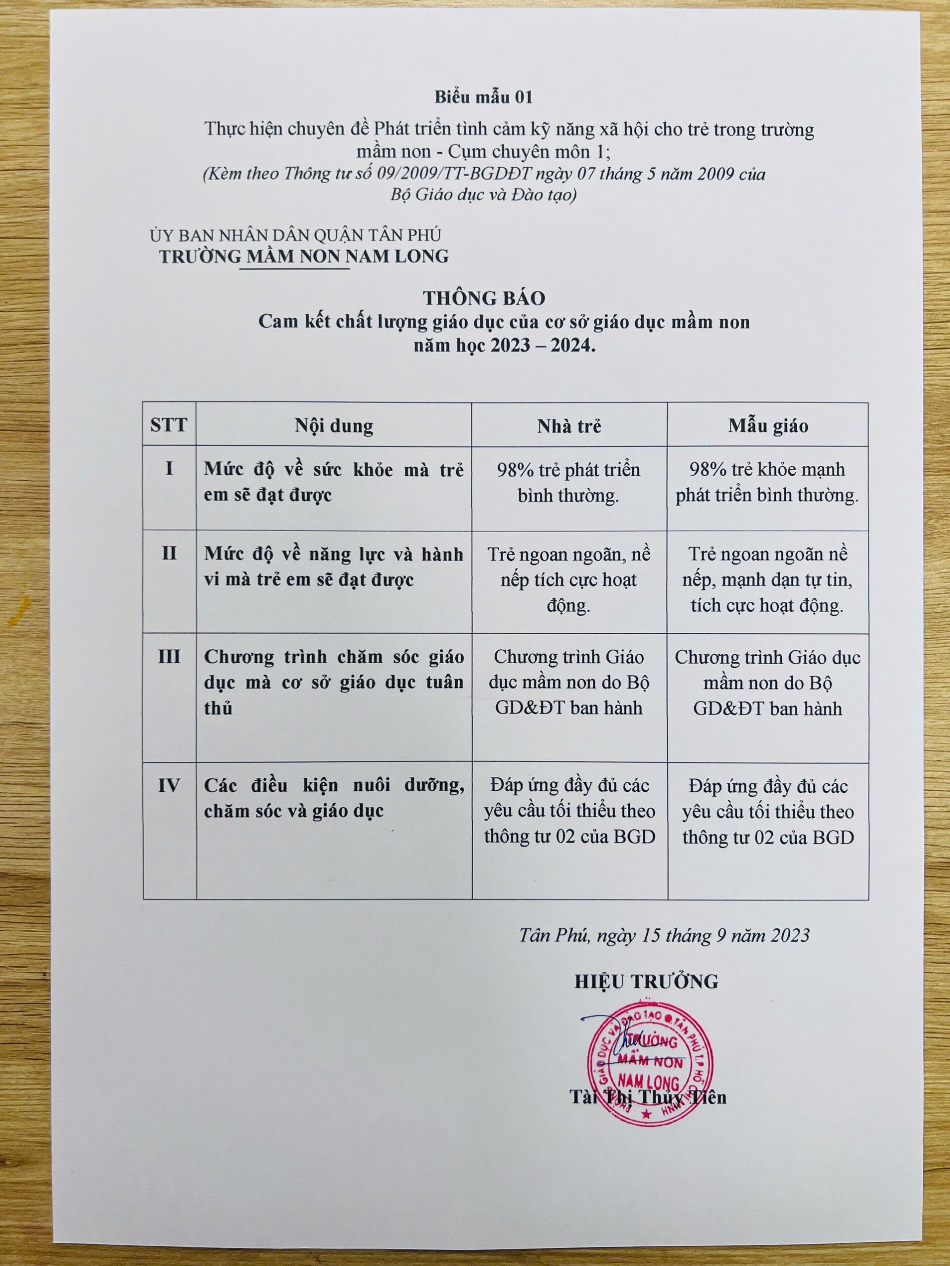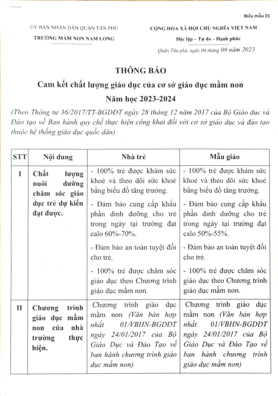 Thông báo: Cam kết chất lượng giáo dục của cơ sở giáo dục mầm non – Năm học 2023 – 2024