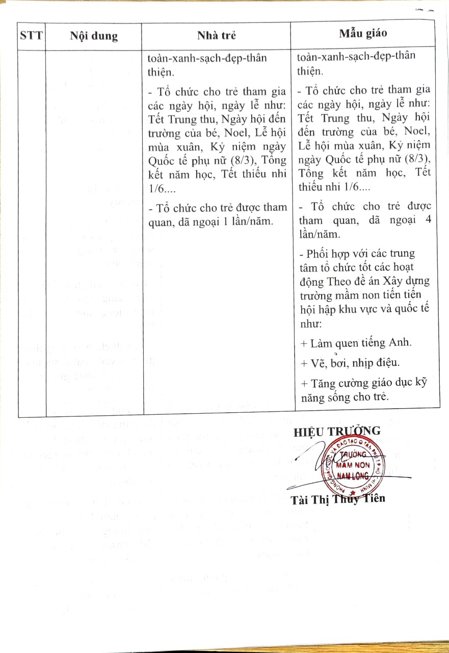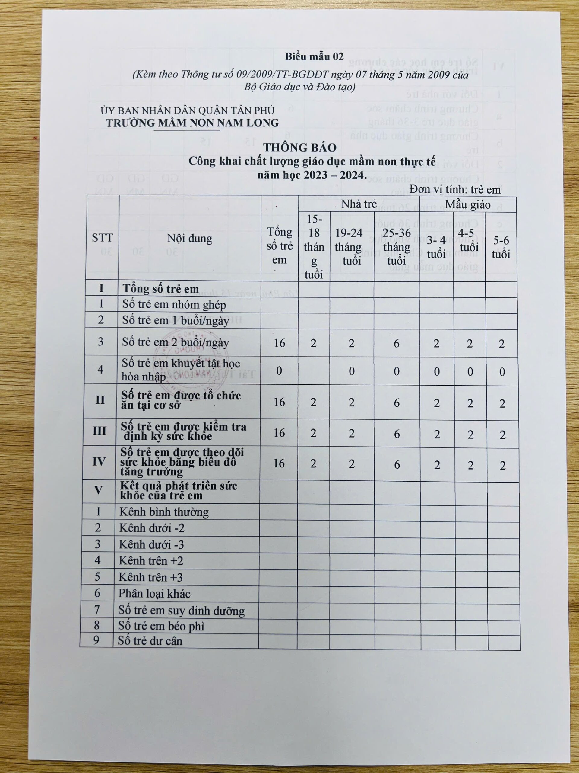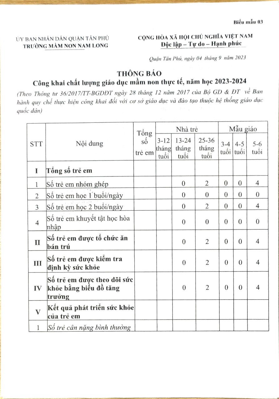 Thông báo: Công khai chất lượng giáo dục mầm non thực tế, Năm học 2023-2024