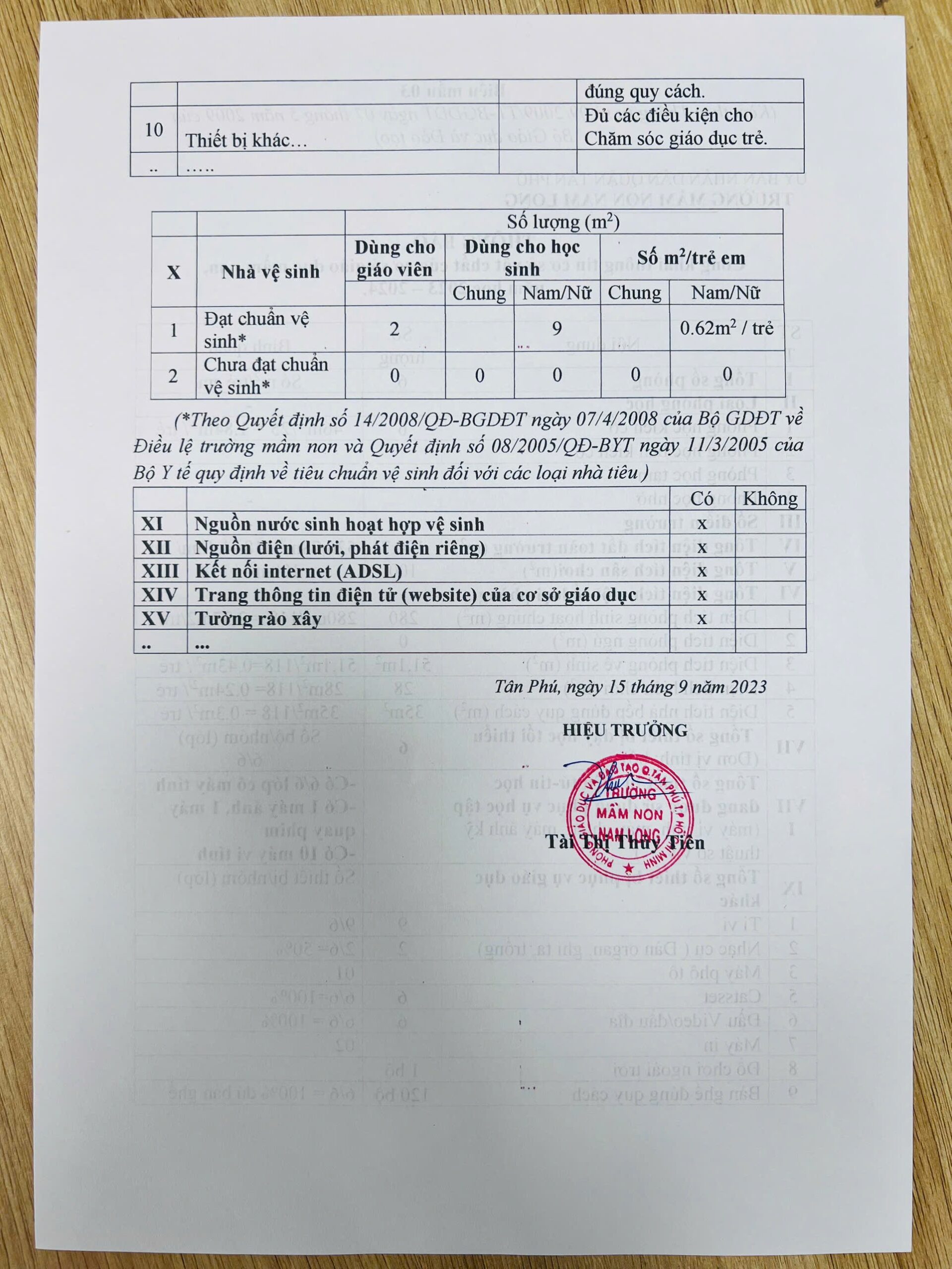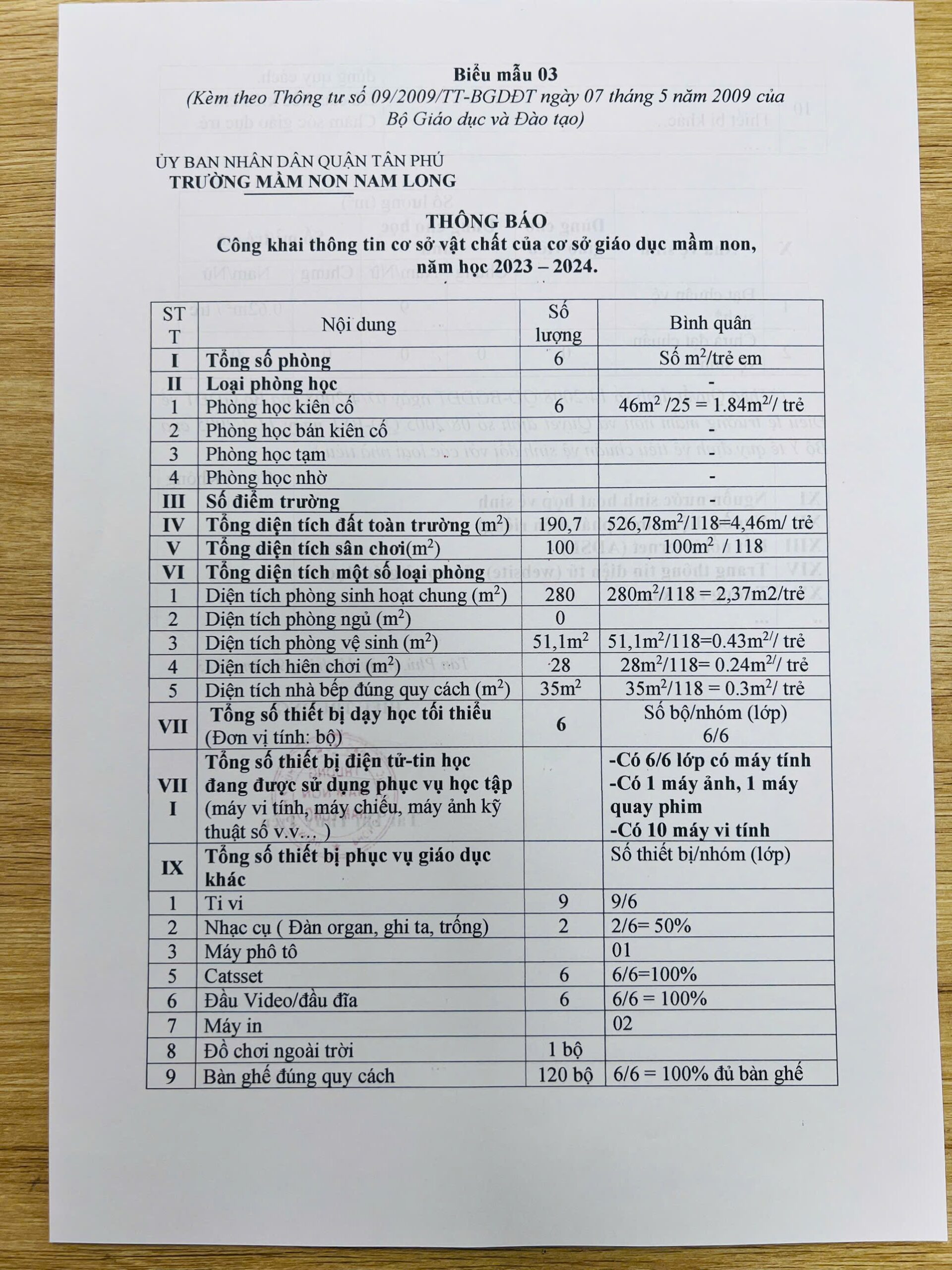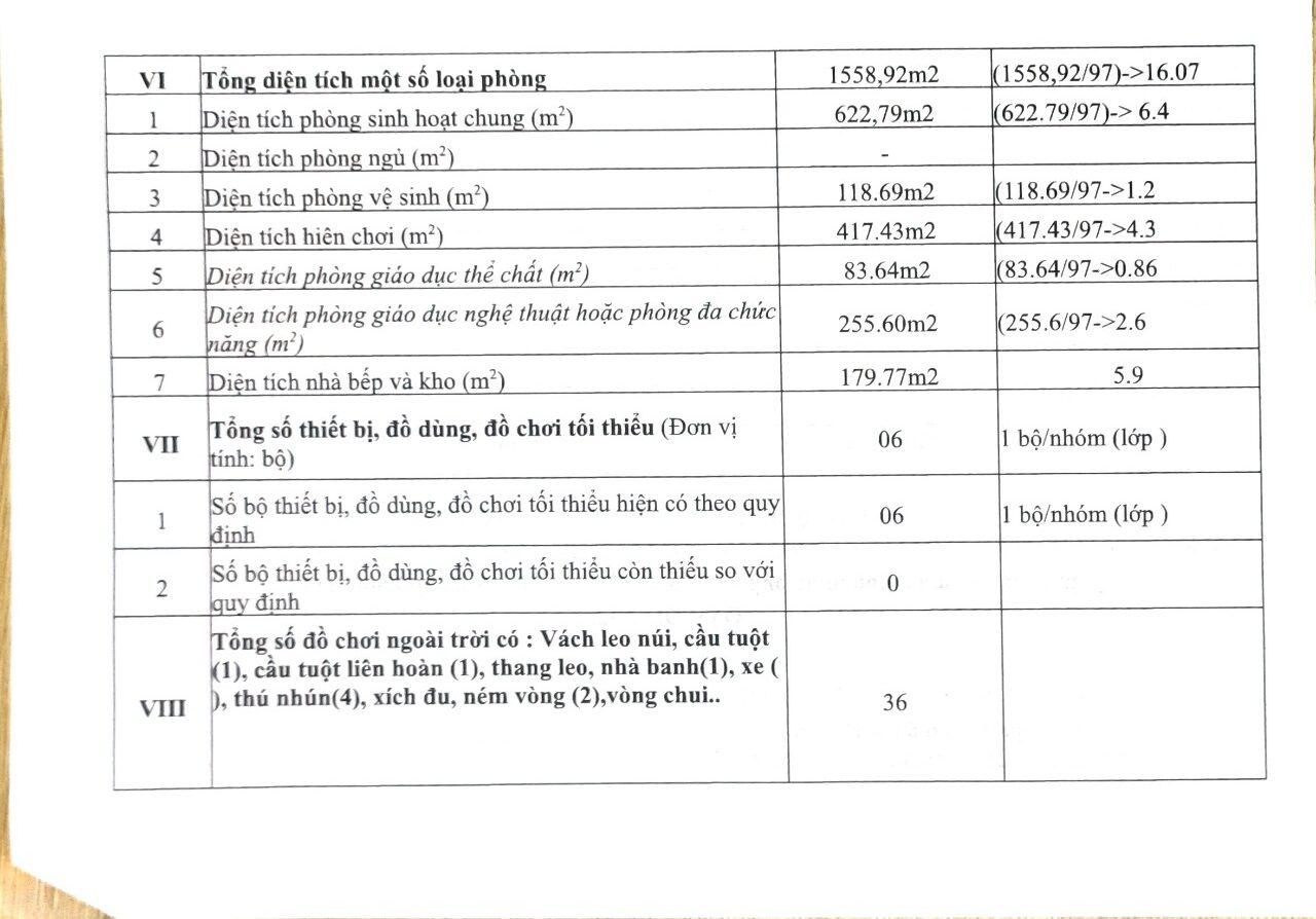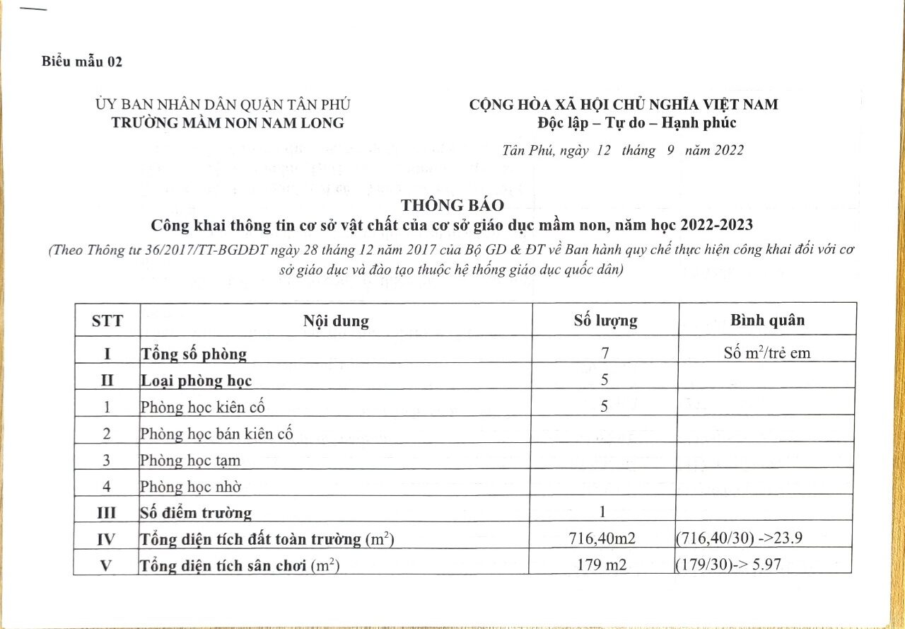 Thông báo: Công khai thông tin cơ sở vật chất của cơ sở giáo dục mầm non, năm học 2023-2024