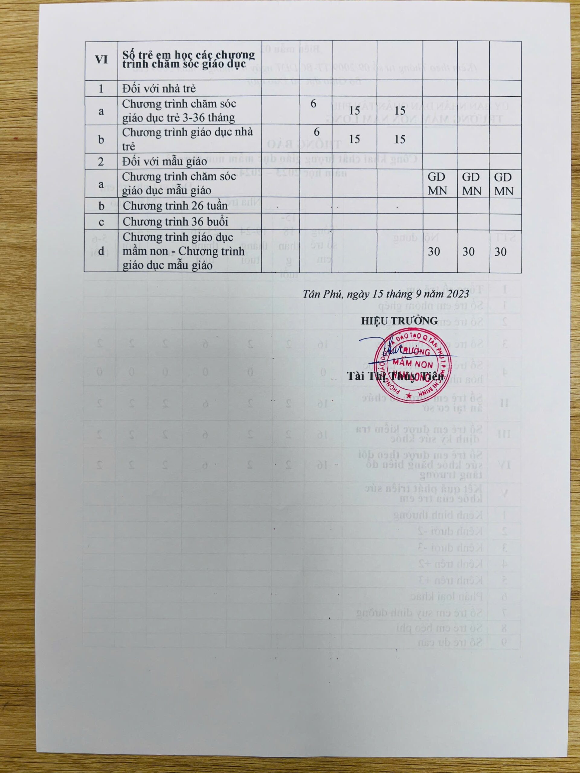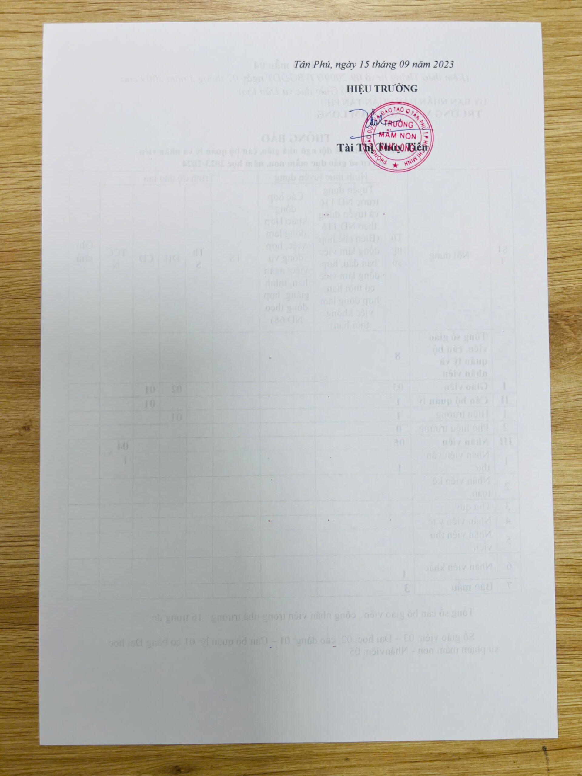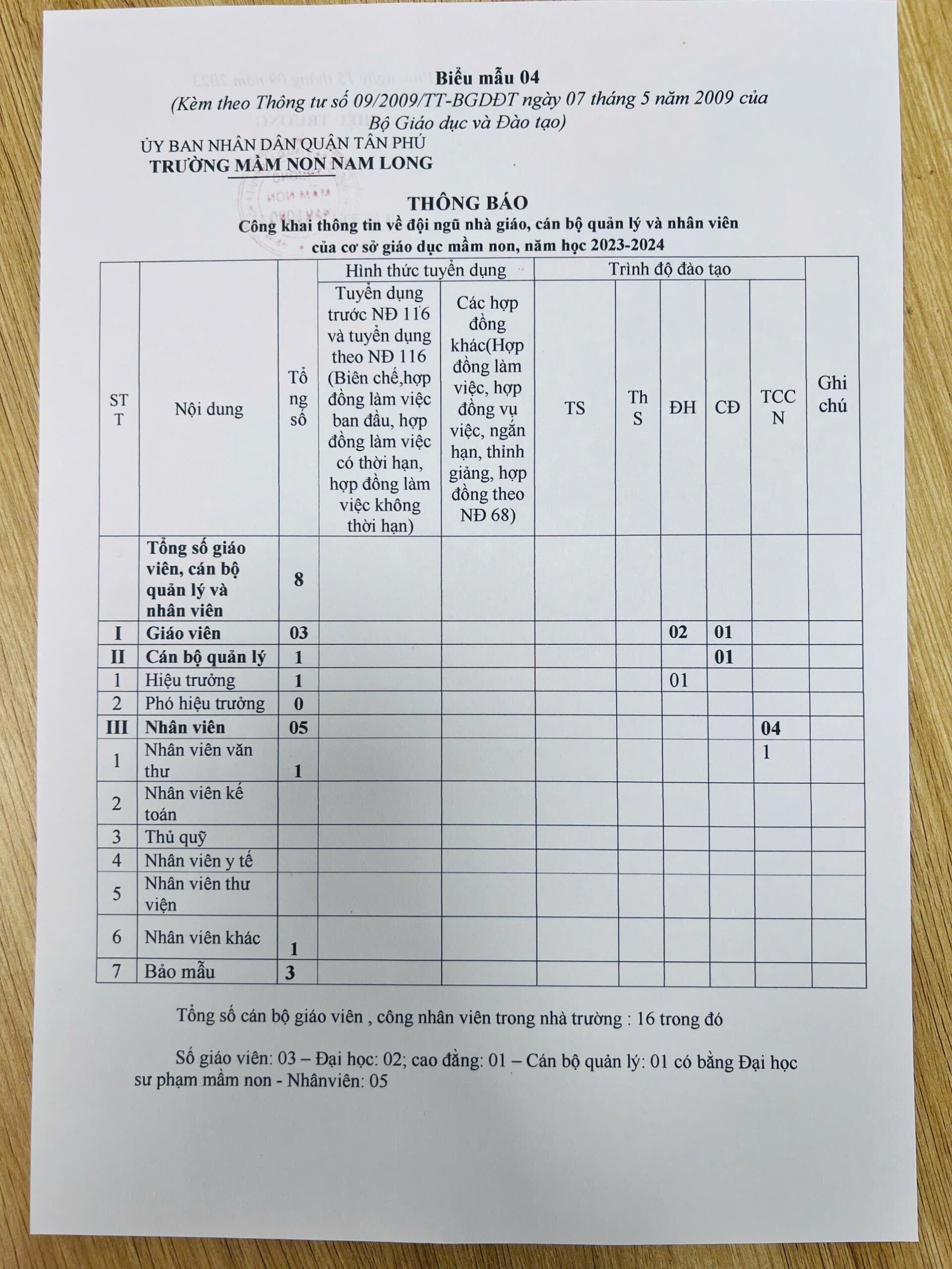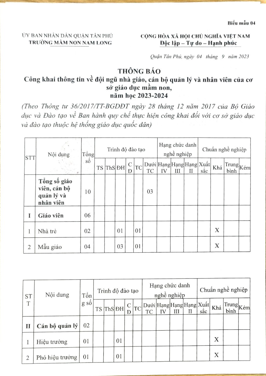 Thông báo: Công khai thông tin về đội ngũ nhà giáo, cán bộ quản lý và nhân viên của cơ sở giáo dục mầm non, năm học 2023-2024